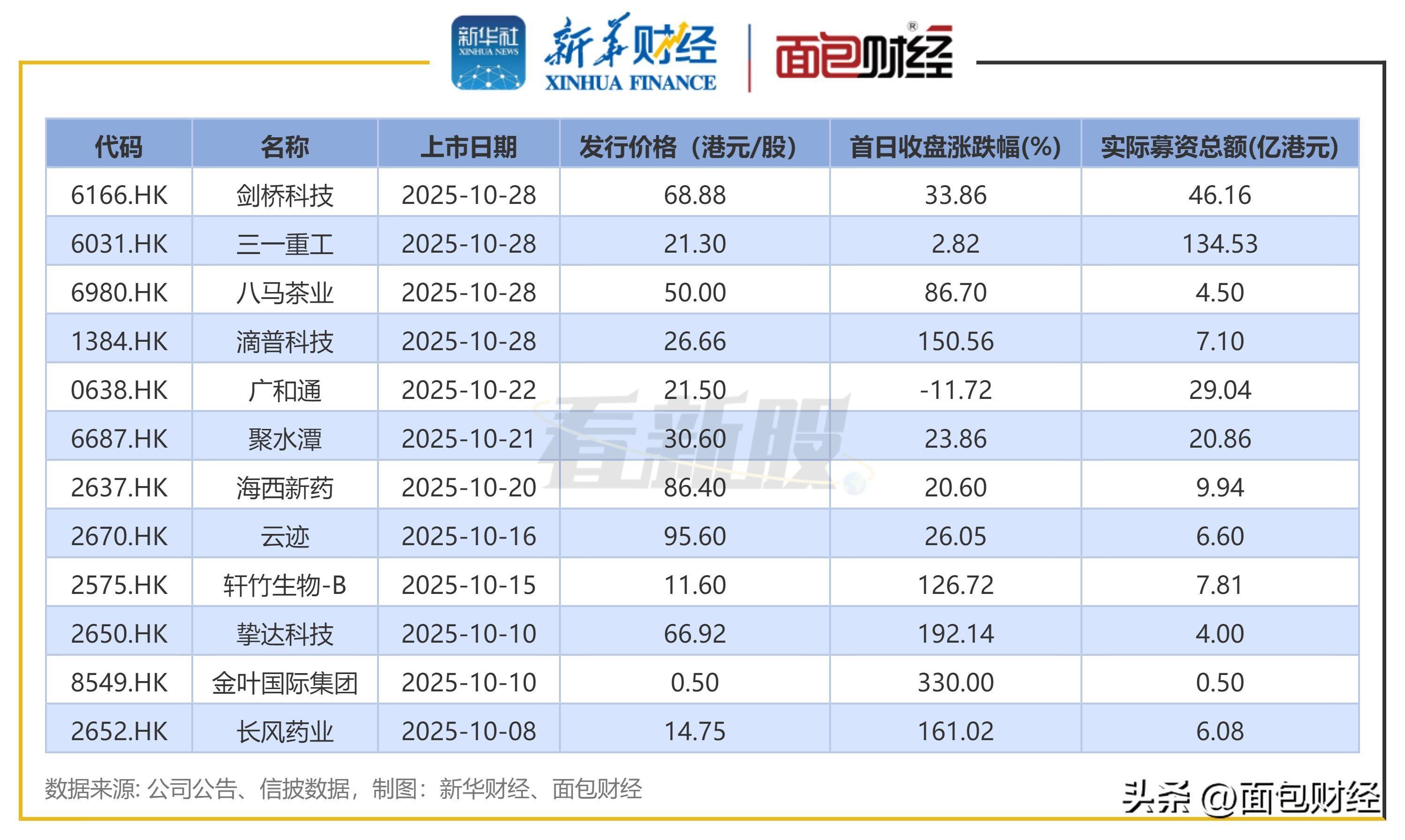 10月上市新股中,三一重工募资总额达134.53亿港元,规模最大。剑桥科技紧随其后,募集约46.16亿港元。此外,广和通、聚水潭募资超过20亿港元。