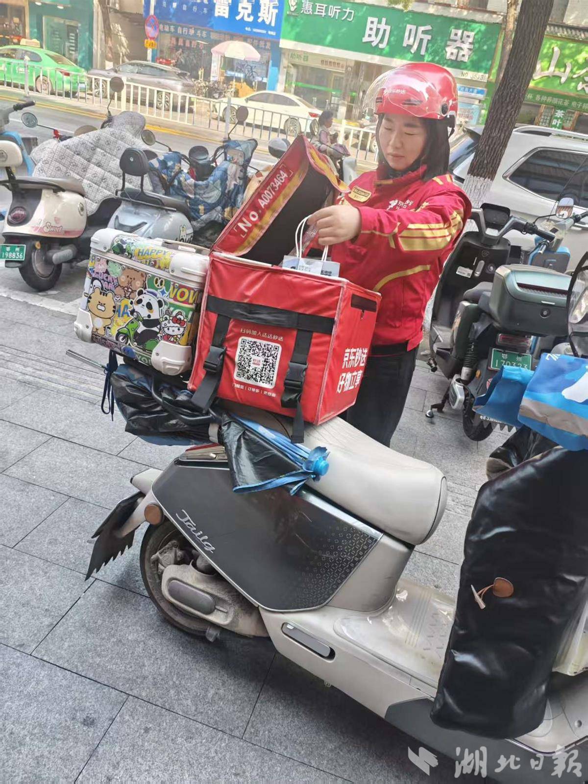 39岁的程秀婷是浠水美团平台年度“闪电骑手”获得者。创业失败后,2020年开始送外卖。有一年暴雨,她冒雨蹚过齐膝积水配送医药订单,浑身湿透仍坚持完成夜间最后一单热粥配送,被顾客拍下背影登上本地热搜。