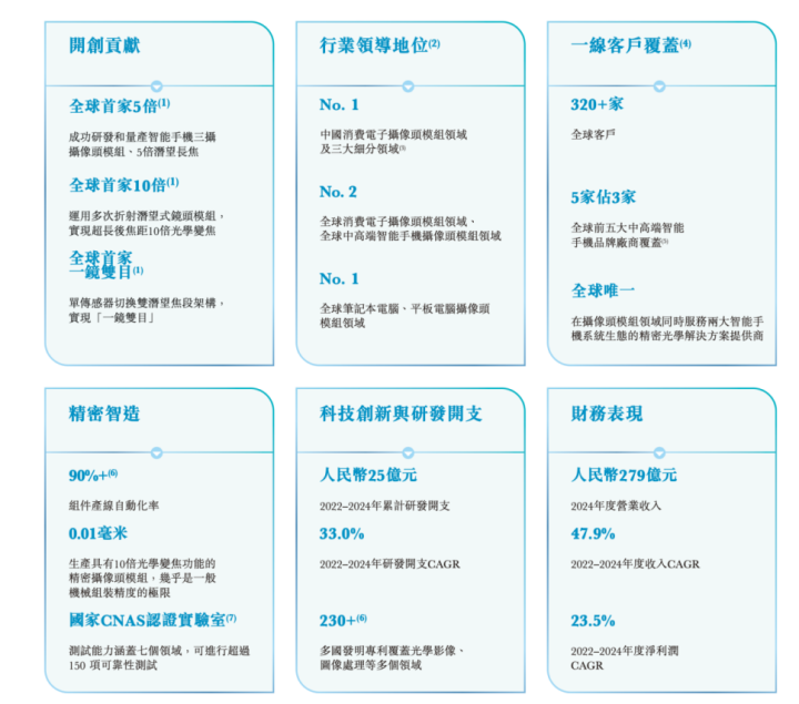 根据弗若斯特沙利文的资料,立景创新是全球头部中高端品牌智能手机厂商的主力供应商,亦是在摄像头模组领域全球唯一一家能同时服务两大智能手机系统生态的精密光学解决方案提供商。基于深厚的光学设计、图像算法、微型封装与其他创新领域能力,立景创新创新性地研发并量产了全球第一款智能手机三摄摄像头模组及“一镜双目”双焦段切换式长焦模组,深度参与全球品牌厂商高端光学模组的创新与迭代,持续推动精密光学解决方案产业向前发展。