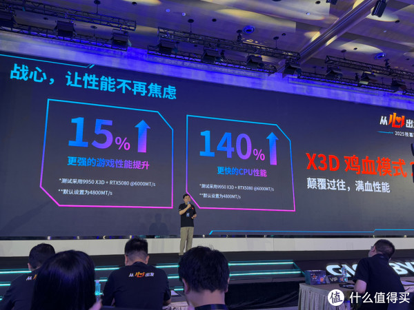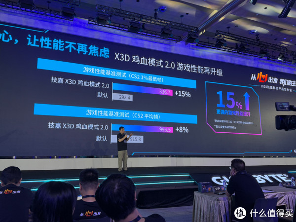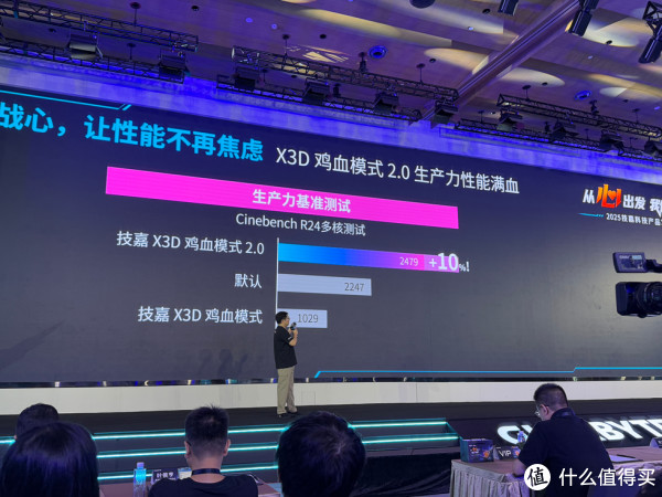 发布会现场重点讲解了技嘉全新X3D主板带来的鸡血模式性能表现,开启后不仅CPU性能与内存频率得到大幅提升,同时在生产力与游戏表现上面表现尤为突出!