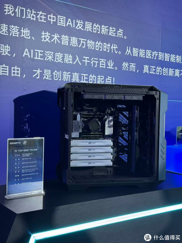 此区域重点展示了技嘉 AI TOP PC整机。采用AMD Ryzen Threadripper PRO 7965WX处理器、技嘉TRX 50 AI TOP 主板以及四路AMD Radeon AI Pro R9700 32G,其超过500 TFLOP/s的超大算力为个人和企业工作者在AI内容创作工作中带来了全新体验。