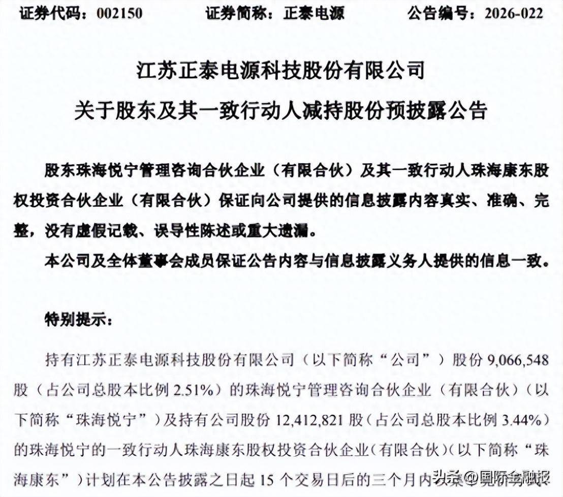 4月20日,江苏正泰电源(002150)发布公告称,因自身资金需求,持有公司906万股(占公司总股本比例2.51%)的股东珠海悦宁及其一致行动人、持有公司股份1241万股(占公司总股本比例 3.44%)的珠海康东,计划在本公告披露之日起15个交易日后的三个月内以集中竞价方式、大宗交易方式,合计减持公司股份不超过1082.6万股,即不超过公司当前总股本的3.00%。